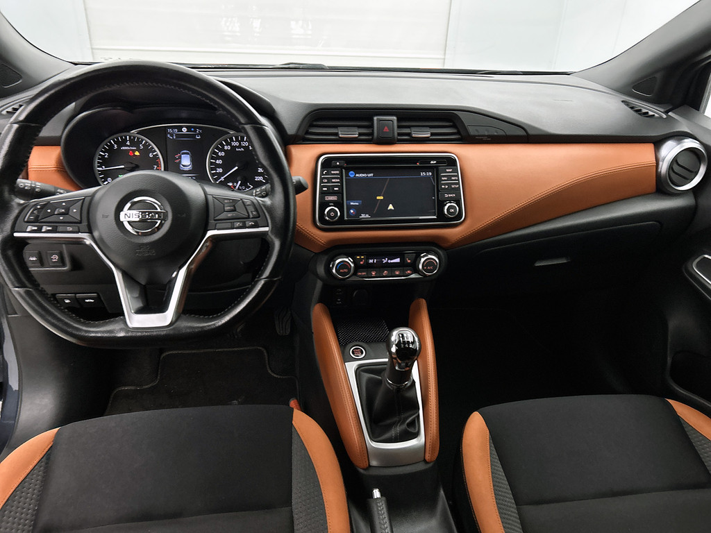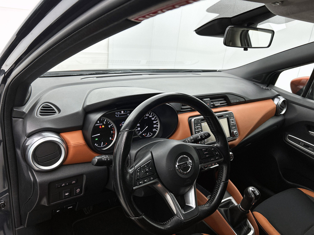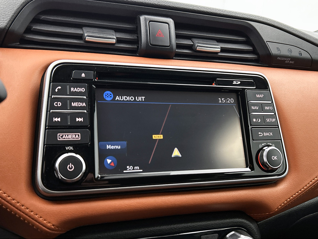 De functie van deze 360 graden camera is vooral nuttig in smalle straatjes waar het zicht beperkt is. De luidsprekers van het high performance audiosysteem omringen u met een uitgebalanceerd geluid. De kortste weg, de zuinigste weg, de snelste weg... elke weg is te vinden met het full map navigatiesysteem. Ook over uw schouder ziet u onderweg niet alles wat er aan de achterzijde gebeurt. Daarom heeft deze Nissan Micra een achteropkomend verkeer waarschuwing. Dankzij automatische airconditioning is het interieur behaaglijk warm of verfrissend koel. Wat u ook in deze auto kunt vinden zijn DAB ontvangst, regensensor, cruise control, keyless entry, lederen stuur en isofix-aansluiting.