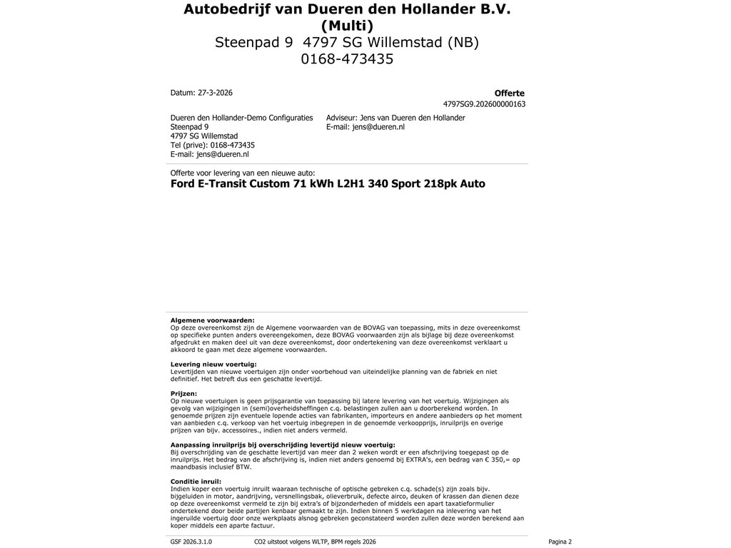 Ford is synoniem met rijplezier. Achter het stuur van deze E-Transit Custom ervaart u zelf wat dat precies betekent. Schoon, stil en fiscaal vriendelijk: met de elektromotor is het zuinig zoeven! Op de teller van deze goed onderhouden auto staat slechts 10 kilometer. De auto is van bouwjaar 2026. Een krachtige motor geeft deze auto zijn sportieve prestaties. De verwarmbare voorstoelen zijn een weldaad voor rug en schouders. Aan alles is gedacht als het gaat om de combinatie gemak en veiligheid. Bijvoorbeeld het in- en uitstappen via de schuifdeur met z'n ruime opening. Bij de uitrusting van deze Ford horen onder meer 17 inch lichtmetalen velgen, LED koplampen, trailer assistent, LED-achterlichten en verstelbare lendensteunen.